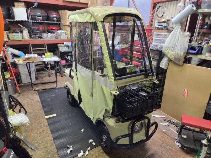 そのあと例のビニールの車体カバー(ほぼレインコートみたいなやつ)を取り付けるんですが、これもまた地味に大変で…。
