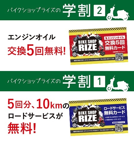 また、バイクショップライズでは学生さん向けに、オイル交換無料カード&ロードサービス無料カードを学割としてプレゼントしています!