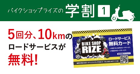 また、バイクショップライズでは学生さん向けに、オイル交換無料カード&ロードサービス無料カードを学割としてプレゼントしています!